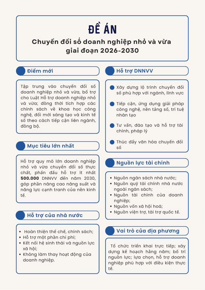Trong bối cảnh hội nhập quốc tế sâu rộng và cạnh tranh ngày càng gay gắt, chuyển đổi số không còn là lựa chọn mà đã trở thành yêu cầu tất yếu. Đề án “Chuyển đổi số các doanh nghiệp nhỏ và vừa giai đoạn 2026–2030” chính là nền tảng quan trọng để Việt Nam tận dụng cơ hội từ cuộc cách mạng công nghiệp lần thứ tư, hướng tới mục tiêu phát triển nhanh và bền vững.