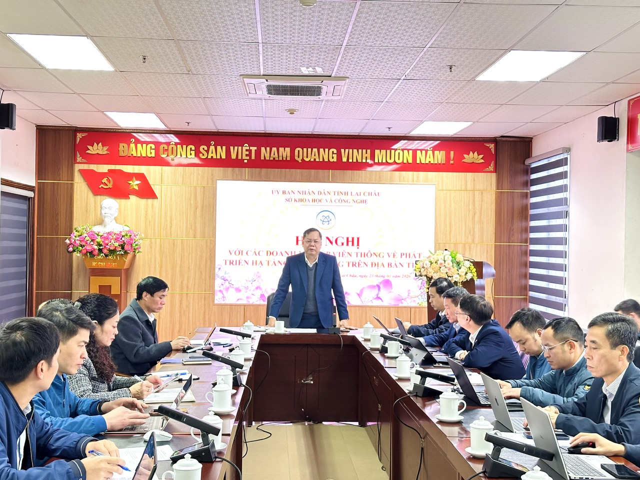 Tham dự buổi làm việc có các đồng chí trong Ban giám đốc Sở KH&CN, đại diện lãnh đạo và chuyên viên: Văn phòng Tỉnh ủy; Văn phòng UBND tỉnh; Đồng chí Trần Kim Long – Giám đốc Công ty Điện lực tỉnh; các doanh nghiệp viễn thông trên địa bàn tỉnh: Vnpt Lai Châu, Viettel Lai Châu, Mobiphone…; Phòng Bưu chính viễn thông CNTT (SKHCN), lãnh đạo Trung tâm Đổi mới sáng tạo và Chuyển đổi số (SKHCN). Đồng chí Dương Đình Đức – Giám đốc Sở KH&CN chủ trì Hội nghị.