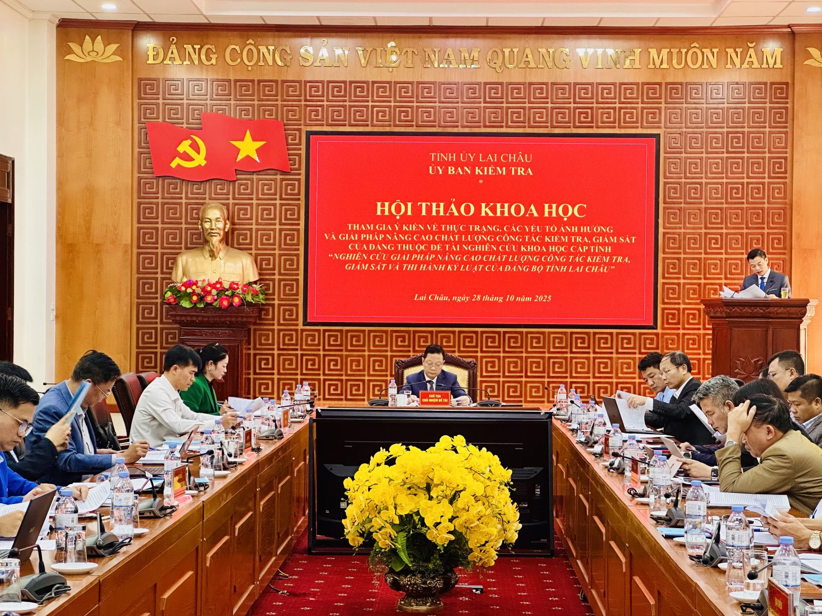 Tại Hội thảo các đại biểu đã được nghe 6 bài tham luận: Vai trò nhận thức trách nhiệm của cấp uỷ trong lãnh đạo, chỉ đạo và thực hiện công tác kiểm tra giám sát và kỷ luật đảng - Thực trạng nguyên nhân và tác động đến chất lượng công tác kiểm tra, giám sát của Đảng bộ tỉnh Lai Châu; Phân tích những yếu tố chủ quan, khách quan tác động đến công tác kiểm tra giám sát và thi hành kỷ luật của Đảng bộ tỉnh thời gian qua; Thực trạng cơ sở vật chất và tổ chức bộ máy, đội ngũ cán bộ của uỷ ban kiểm tra, cơ quan uỷ ban kiểm tra từ tỉnh đến cơ sở - mối liên hệ với chất lượng công tác kiểm tra giám sát, thi hành kỷ luật của Đảng; Phương hướng, nhiệm vụ về công tác kiểm tra giám sát và thi hành kỷ luật đảng trong Đảng bộ tỉnh Lai Châu trong thời gian tới; Giải pháp nâng cao chất lượng uỷ ban kiểm tra các cấp trong tham mưu, giúp cấp uỷ thực hiện công tác kiểm tra, giám sát và kỷ luật của Đảng bộ tỉnh Lai Châu; Giải pháp nâng cao chất lượng công tác kiểm tra giám sát, kỷ luật đảng của cấp uỷ, UBKT cấp cơ sở và cấp trên trực tiếp cơ sở trong Đảng bộ tỉnh Lai Châu thời gian tới;