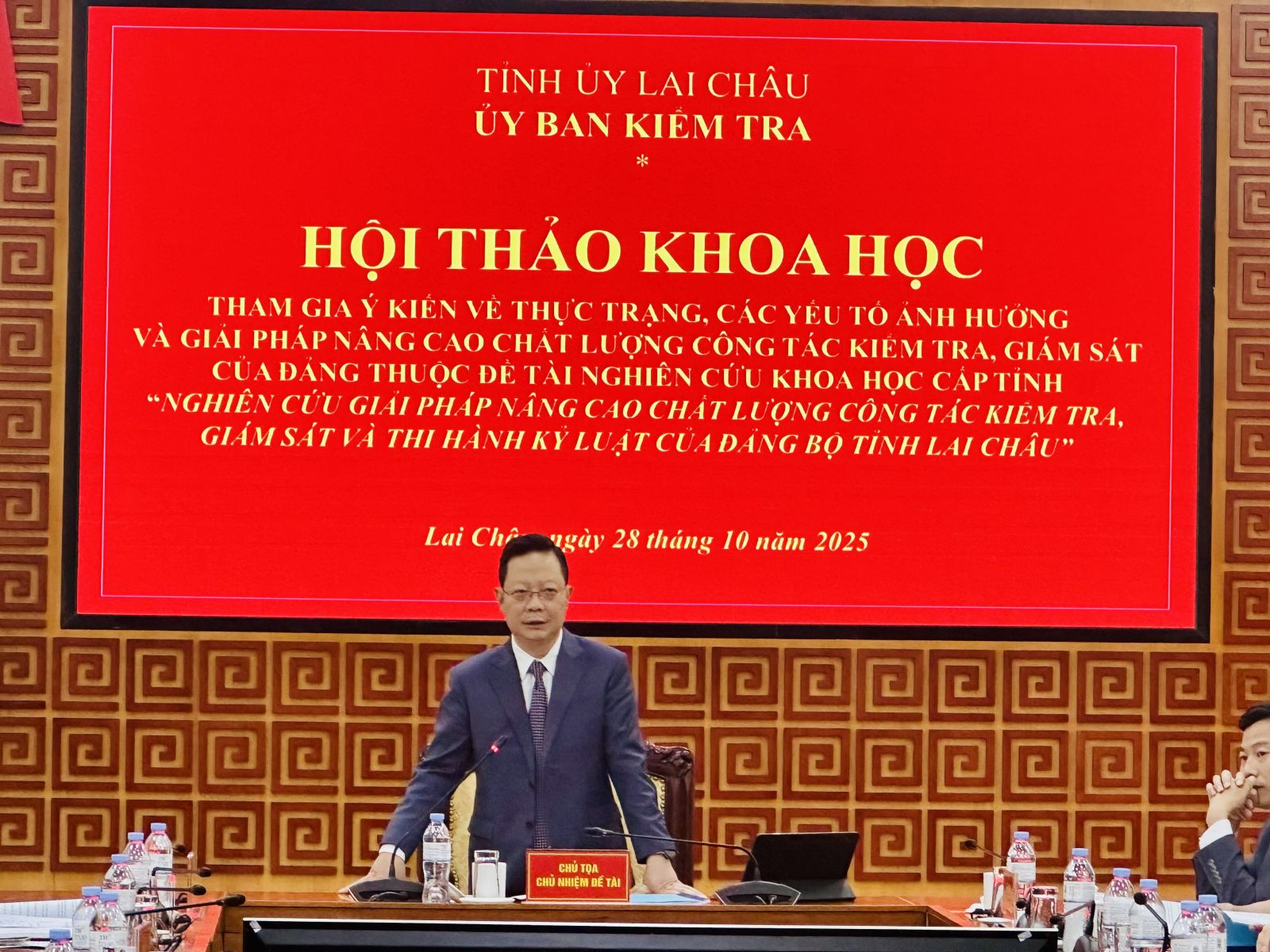 Phát biểu khai mạc Hội thảo, đồng chí Nguyễn Ngọc Vinh Uỷ viên ban thường vụ, chủ nhiệm uỷ ban kiểm tra tỉnh uỷ: Với mục tiêu đánh giá toàn diện thực trạng công tác kiểm tra, giám sát, kỷ luật đảng của Đảng bộ tỉnh Lai Châu, phân tích các nguyên nhân, yếu tố ảnh hưởng và đề xuất hệ thống giải pháp nâng cao chất lượng công tác kiểm tra, giám sát trong thời gian tới và cụ thể hóa các nội dung nghiên cứu cốt lõi của đề tài, tập trung phân tích sâu sắc các tồn tại, yếu tố tác động đến hiệu lực, hiệu quả kiểm tra, giám sát trong thực tiễn; từ đó làm rõ cơ sở thực tiễn cho các kiến nghị, đề xuất. Hội thảo lần này là diễn đàn quan trọng để chúng ta trao đổi, làm rõ hơn những vấn đề sau: Đánh giá toàn diện thực trạng công tác kiểm tra, giám sát từ cấp tỉnh đến cấp cơ sở trong Đảng bộ tỉnh; Phân tích các yếu tố ảnh hưởng đến chất lượng công tác kiểm tra, giám sát, bao gồm cả yếu tố khách quan và chủ quan. Trong đó, cần chú trọng làm rõ ảnh hưởng của việc chuyển đổi mô hình tổ chức chính quyền địa phương sang hai cấp; làm rõ mức độ ảnh hưởng của từng yếu tố đối với chất lượng, hiệu quả hoạt động kiểm tra, giám sát; đề xuất các giải pháp khả thi, có tính ứng dụng thực tiễn cao, phù hợp với đặc thù tổ chức của Đảng bộ tỉnh Lai Châu, đảm bảo sát thực tế, có tính lâu dài, đặc biệt chú trọng tới các nhóm giải pháp về lãnh đạo, tổ chức bộ máy, cơ chế phối hợp, nâng cao năng lực cán bộ, ứng dụng công nghệ, và tăng cường đào tạo, tập huấn. … Đây là dịp để các đồng chí đại biểu, các nhà quản lý, các cán bộ kiểm tra cùng trao đổi, chia sẻ những ý kiến tâm huyết, sâu sắc và xác đáng. Mỗi ý kiến phátbiểu, mỗi bài tham luận tại Hội thảo đều có giá trị thực tiễn cao, là nguồn tư liệu quý để Ban Chủ nhiệm đề tài tiếp tục nghiên cứu hoàn thiện nội dung Đề tài, đáp ứng yêu cầu, nhiệm vụ chính trị và khoa học.