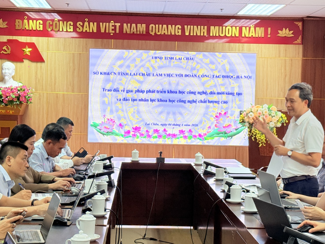 Phát biểu khai mạc buổi làm việc Đồng chí Phạm Quang Cường - Phó Giám đốc Sở đã báo cáo kết quả hoạt động về khoa học và Công nghệ của Sở đang thực hiện cũng như đánh giá tiềm năng thế mạnh của tỉnh để đưa ra định hướng một số nội dung hợp tác, nghiên cứu với Đoàn như: Việc ứng dụng khoa học công nghệ phát triển sản phẩm sâm Lai Châu, các loại cây dược liệu thế mạnh trên địa bàn tỉnh; Ưng dụng khoa học công nghệ trong quản lý tài nguyên thiên nhiên, phòng chống thiên tai; Ứng dụng công nghệ AI, IOT trong việc bảo tồn, phổ biến văn hoá các dân tộc tỉnh Lai Châu gắn với phát triển du lịch cộng đồng; tổ chức các hoạt động kết nối thị trường khoa học công nghệ; Dự án thí điểm nông nghiệp thông minh, hệ thống tưới nhỏ giọt thông minh, cảm biến, môi trường dự báo sâu bệnh đối với chè, dâu tằm tại xã Bản Bo; ứng dụng công nghệ số, AI trong các lĩnh vực giáo dục, xử lý môi trường chất thải chăn nuôi, sinh hoạt, công nghiệp, sản xuất năng lượng tái tạo đặc biệt ứng dụng khoa học công nghệ hiện đại để chiết suất, chế tạo sản phẩm mới từ các sản phẩm chủ lực của địa phương như chè, mắc ca, mật ong…