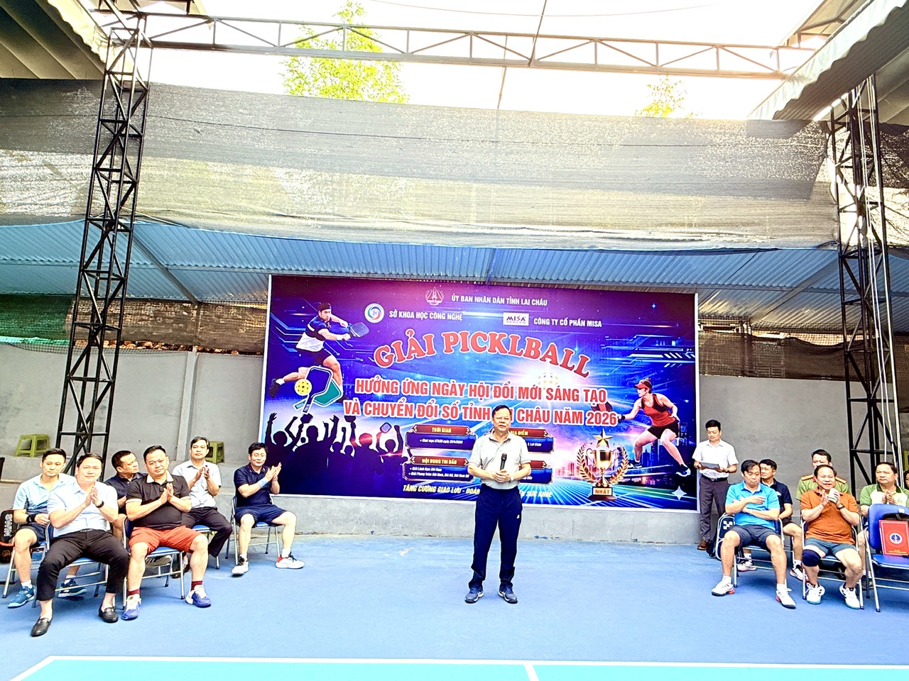 Phát biểu khai mạc giải đấu, đồng chí Dương Đình Đức – Tỉnh ủy viên, Giám đốc Sở Khoa học và Công nghệ nhấn mạnh: Giải Pickleball hưởng ứng Ngày hội Đổi mới sáng tạo và Chuyển đổi số tỉnh Lai Châu năm 2026 không chỉ là hoạt động thể thao ý nghĩa, thiết thực mà còn là dịp quan trọng nhằm lan tỏa mạnh mẽ tinh thần đổi mới sáng tạo trong toàn xã hội. Thông qua giải đấu, Ban Tổ chức mong muốn tăng cường sự gắn kết, giao lưu giữa các cơ quan, đơn vị, doanh nghiệp; đồng thời khuyến khích mỗi cán bộ, công chức, viên chức phát huy tư duy đổi mới, chủ động ứng dụng khoa học công nghệ và chuyển đổi số vào công việc và cuộc sống. Đồng chí tin tưởng rằng, với tinh thần đoàn kết, trung thực và cao thượng, các vận động viên sẽ thi đấu hết mình, góp phần tạo nên một giải đấu thành công, để lại dấu ấn tốt đẹp và tiếp tục lan tỏa thông điệp về một Lai Châu năng động, sáng tạo, phát triển trong thời kỳ chuyển đổi số.