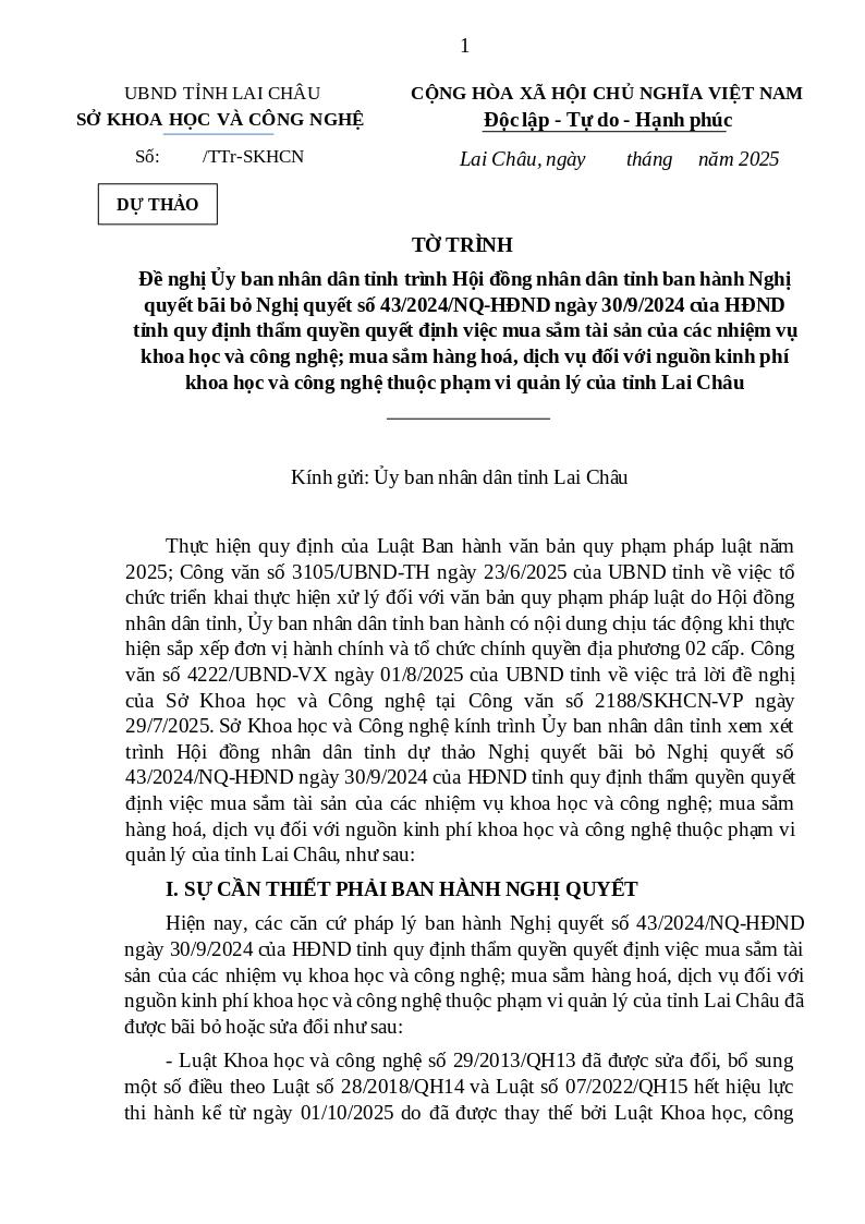 Căn cứ chức năng, nhiệm vụ Sở Khoa học và Công nghệ đã chủ trì, phối hợp với các cơ quan có liên quan tổ chức soạn thảo, xây dựng dự thảo Nghị quyết Bãi bỏ Nghị quyết số 43/2024/NQ-HĐND ngày 30/9/2024 của HĐND tỉnh quy định thẩm quyền quyết định việc mua sắm tài sản của các nhiệm vụ khoa học và công nghệ; mua sắm hàng hoá, dịch vụ đối với nguồn kinh phí khoa học và công nghệ thuộc phạm vi quản lý của tỉnh Lai Châu.