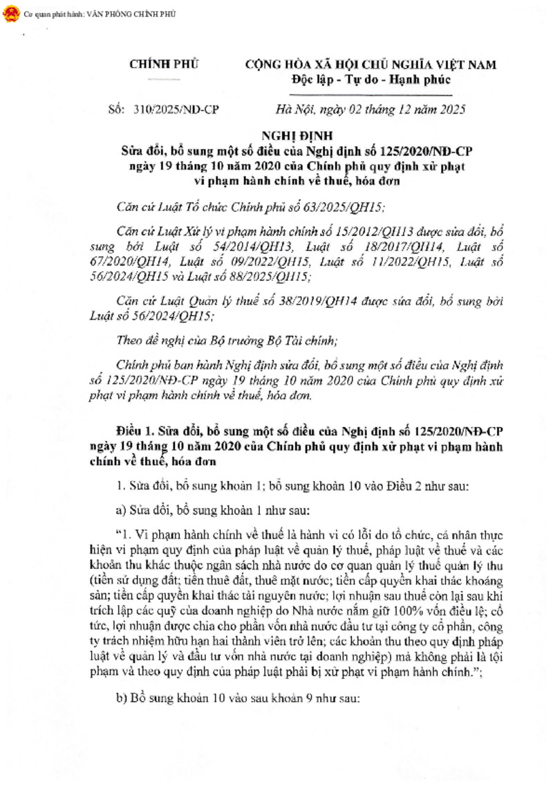 | Tiêu đề văn bản | Sửa đổi, bổ sung một số điều của Nghị định số 125/2020/NĐ-CР ngày 19 tháng 10 năm 2020 của Chính phủ | ||