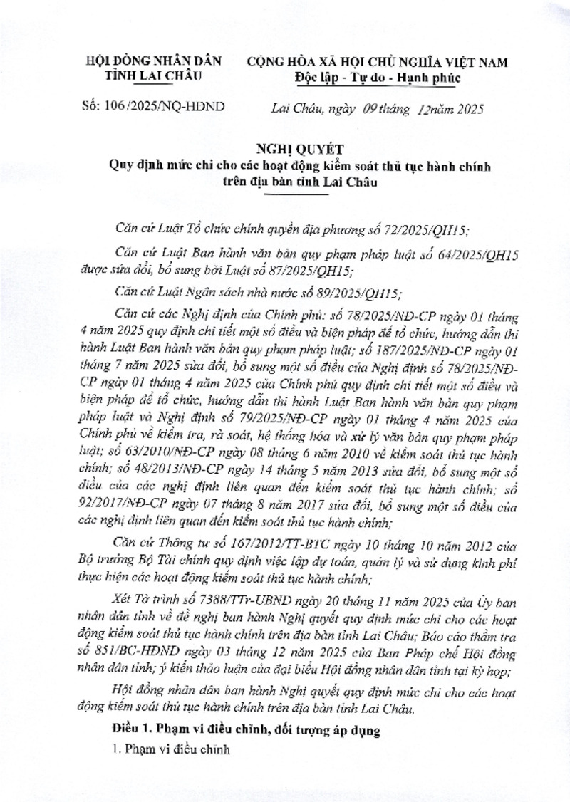 1.Nghị quyết quy định mức chi cho các hoạt động kiểm soát thủ tục hành chính trên địa bàn tỉnh Lai Châu.