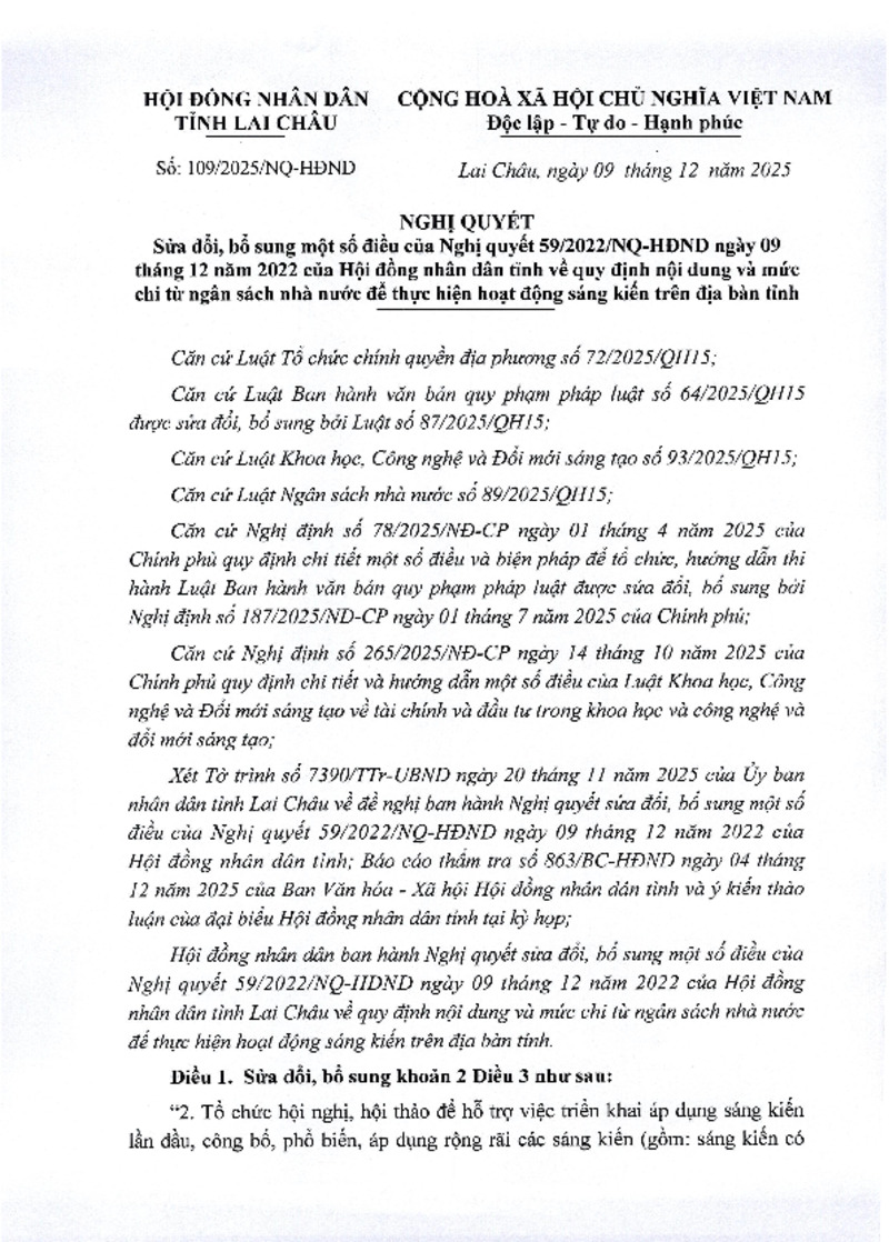 | Tiêu đề văn bản | Nghị quyết sửa đổi, bổ sung một số điều của Nghị quyết 59/2022/NQ-HĐND ngày 09/12/2022 của HĐND tỉnh về quy định nội dung và mức chi từ ngân sách nhà nước để thực hiện hoạt động sáng kiến trên địa bàn tỉnh. | ||