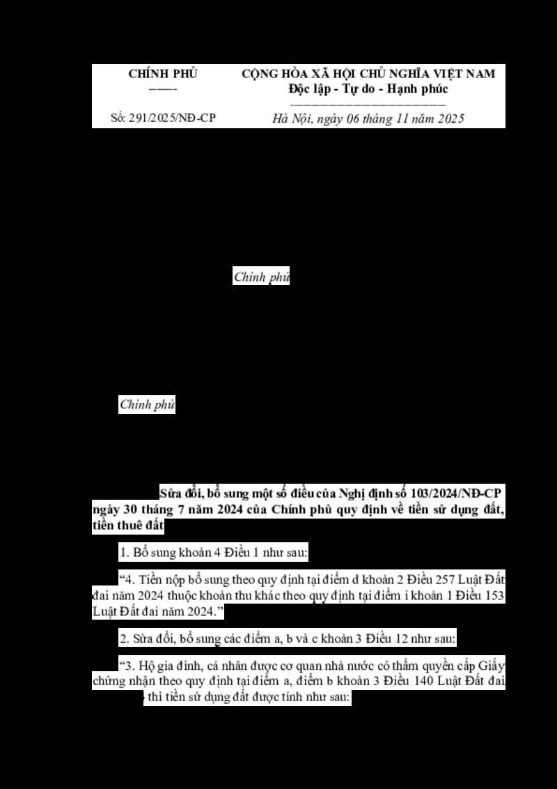 1.Nghị định số 291/2025/NĐ-CP ngày 06/11/2025 của Chính phủ sửa đổi, bổ sung một số điều của Nghị định số 103/2024/NĐ-CP ngày 30 tháng 7 năm 2024 của Chính phủ quy định về tiền sử dụng đất, tiền thuê đất