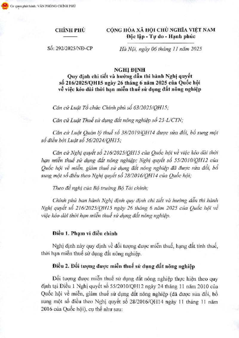 1.Nghị định số 292/2025/NĐ-CP ngày 06/11/2025 của Chính phủ Quy định chi tiết và hướng dẫn thi hành Nghị quyết số 216/2025/QH15 ngày 26 tháng 6 năm 2025 của Quốc hội về việc kéo dài thời hạn miễm thuế sử dụng đất Nông nghiệp đến toàn thể công chức, viên chức, người lao động thuộc phạm vi quản lý bằng nhiều hình thức phù hợp, hiệu quả