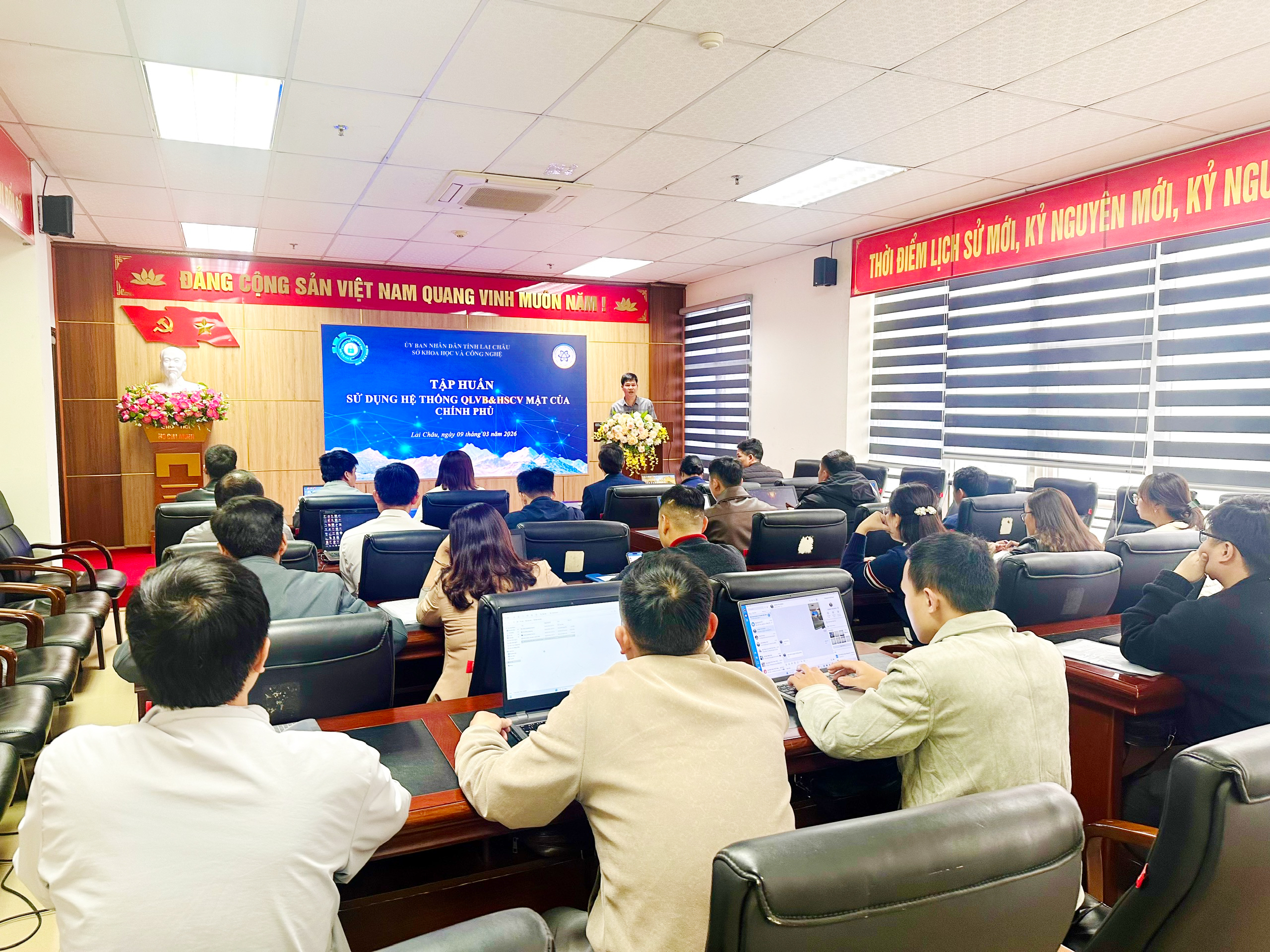 Tham dự lớp tập huấn có đại diện lãnh đạo các xã, cán bộ phụ trách Hệ thống QLVB&HSCV mật của Chính phủ tại 38 xã, phường trên địa bàn tỉnh Lai Châu, Các giảng viên của Viettel Lai Châu, Trung tâm Đổi mới sáng tạo và Chuyển đổi số - Sở Khoa học và Công nghệ.