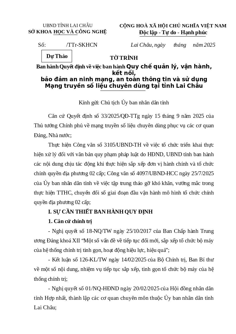 Dự thảo Quy chế bao gồm 3 Chương 18 điều; quy định về hoạt động quản lý, vận hành, kết nối, bảo đảm an ninh mạng, an toàn thông tin và sử dụng Mạng truyền số liệu chuyên dùng tại tỉnh Lai Châu; Mục tiêu của Quy chế nhằm hoàn thiện cơ chế quản lý Mạng truyền số liệu chuyên dùng (Mạng TSLCD) trên địa bàn tỉnh; bảo đảm vận hành ổn định, an toàn, thông suốt; đáp ứng yêu cầu bảo mật thông tin phục vụ công tác chỉ đạo, điều hành của các cơ quan Đảng, Nhà nước, các tổ chức chính trị - xã hội và đơn vị sự nghiệp công lập. Quy chế cũng quy định rõ trách nhiệm của các cơ quan, đơn vị trong việc kết nối, sử dụng, bảo đảm an ninh mạng, an toàn thông tin và truyền đưa bí mật nhà nước trên Mạng TSLCD.