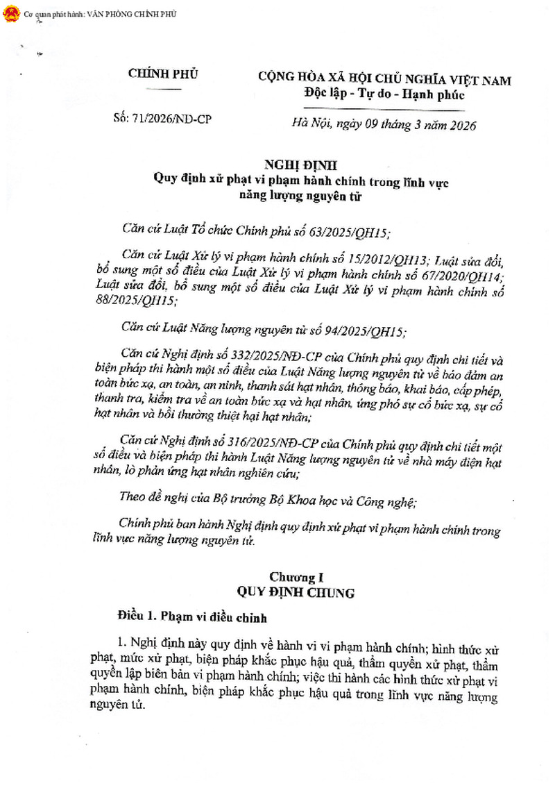 | Tiêu đề văn bản | Nghị định số 71/2026/NĐ - CP quy định xử phạt vi phạm hành chính trong lĩnh vực năng lượng nguyên tử | ||
