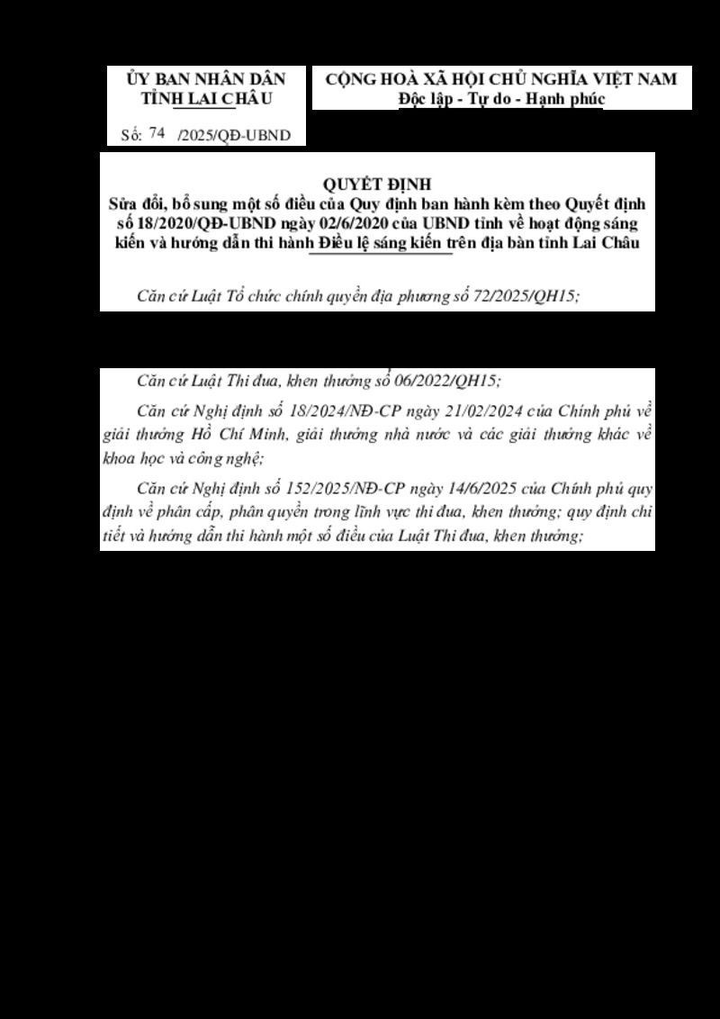 | Tiêu đề văn bản | Sửa đổi, bổ sung một số điều của Quy định ban hành kèm theo Quyết định số 18/2020/QĐ-UBND ngày 02/6/2020 của UBND tỉnh về hoạt động sáng kiến và hướng dẫn thi hành Điều lệ sáng kiến trên địa bàn tỉnh Lai Châu | ||